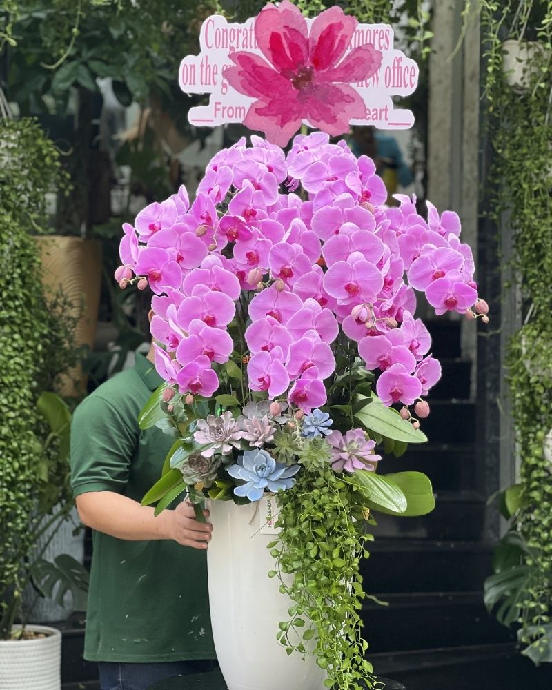 Hoa Tươi Hoa Mỹ: Quá dễ luôn! Bình Hưng có nhiều công ty lớn, khách bên đó hay đặt hoa lan hồ điệp sang trọng hoặc bó hoa cao cấp tặng đối tác. Nếu muốn tạo ấn tượng mà vẫn tinh tế, em nên chọn chậu lan trắng hoặc mix sen đá – vừa thanh lịch vừa nổi bật. Giao nhanh 120 phút, kèm thiệp chúc mừng miễn phí.