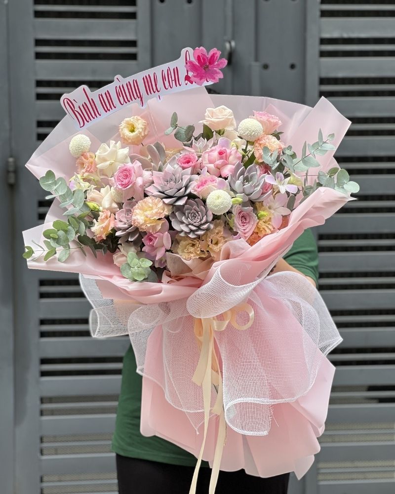Hoa Tươi Hoa Mỹ: Đơn giản thôi! Chị chọn mẫu “hoa vừa thanh lịch vừa có giá trị nội dung cao” – ví dụ như lan hồ điệp trắng mix vàng. Còn tụi em sẽ ghi thiệp kiểu: “Tặng mẹ người yêu con – đẹp như hoa, nhưng hiền hơn con nhiều!”. Thế là bà mẹ vừa cười vừa gật đầu luôn!
