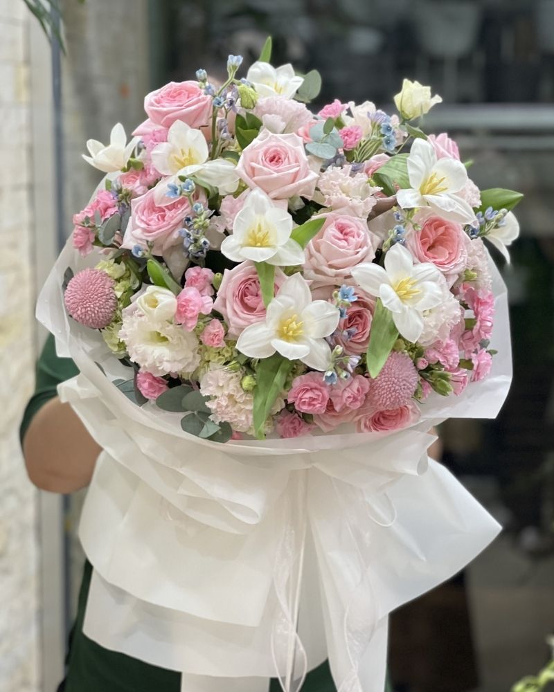 Khách hàng: Bữa kia em lướt TikTok thấy có mẫu bó hoa nhìn như phim Hàn, shop mình có không?