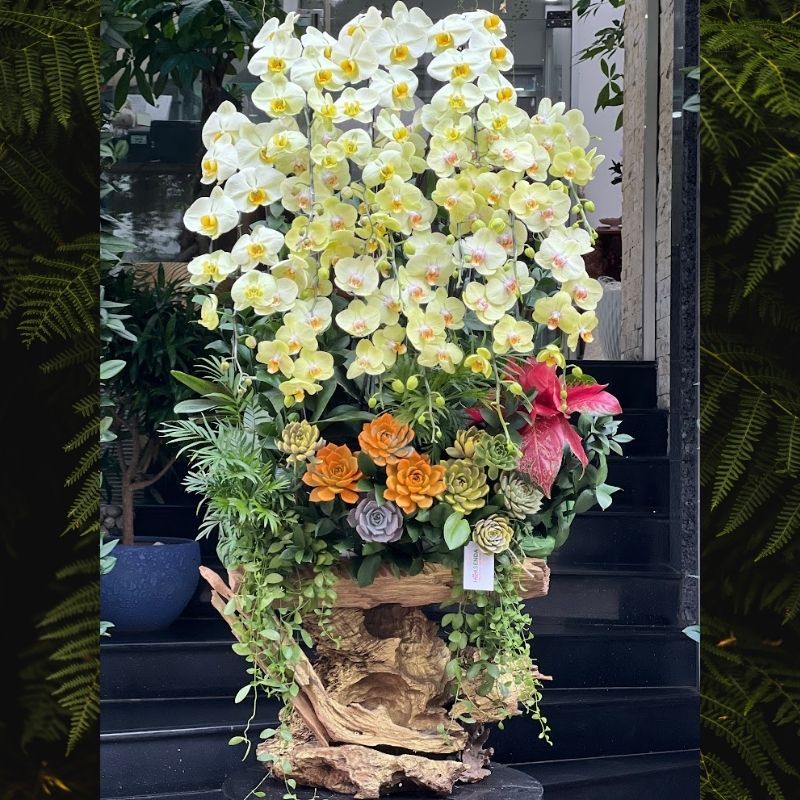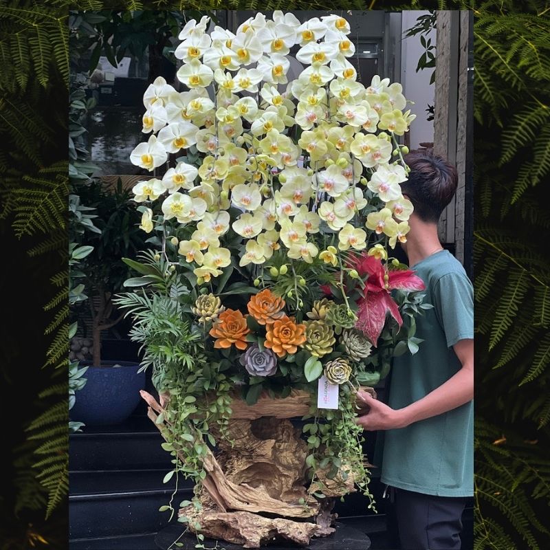 - Sản phẩm chất lượng: Hoa lan hồ điệp, sen đá và lũa gỗ tươi, đẹp, được chăm sóc kỹ lưỡng.