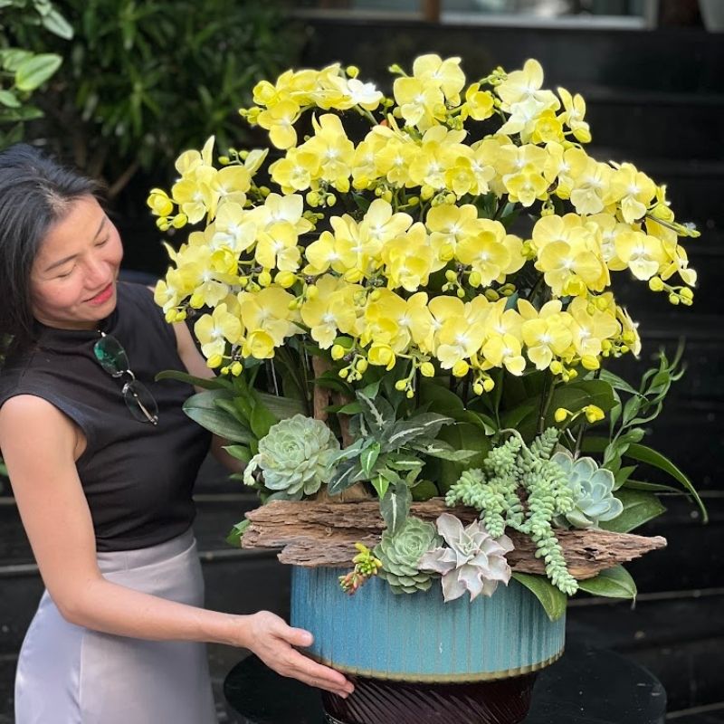 Bình hoa lan mau vang mix sen đá siêu đắt giá