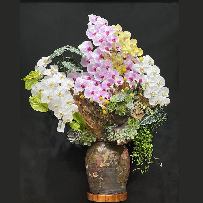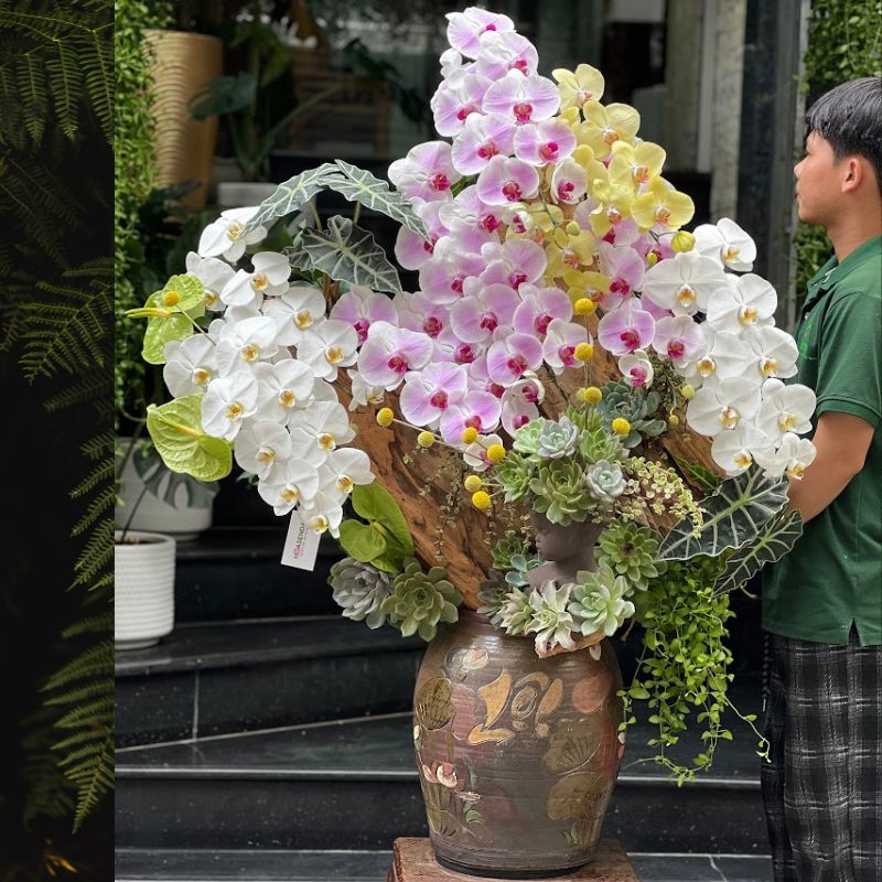 Nếu bạn đang tìm kiếm một tác phẩm hoa không chỉ để chưng mà còn để “trấn” không gian, mang lại vượng khí và khẳng định đẳng cấp gia chủ, thì Siêu phẩm Lan Hồ Điệp Mix 3 Màu Kết Hợp Gỗ Lũa & Tiểu Cảnh chính là câu trả lời hoàn hảo nhất. Đây là sự giao thoa giữa nét đẹp hiện đại của hoa lan và chiều sâu văn hóa của gốm sứ truyền thống.