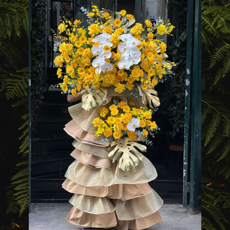 Kệ hoa chúc mừng khai trương màu vàng là lựa chọn hoàn hảo. Nó phù hợp để tặng trong các dịp: