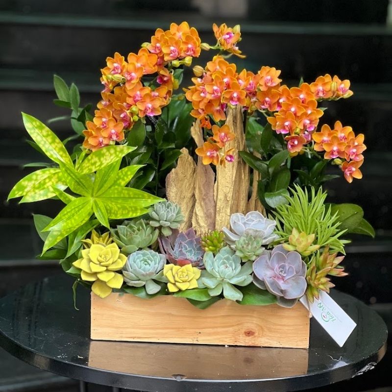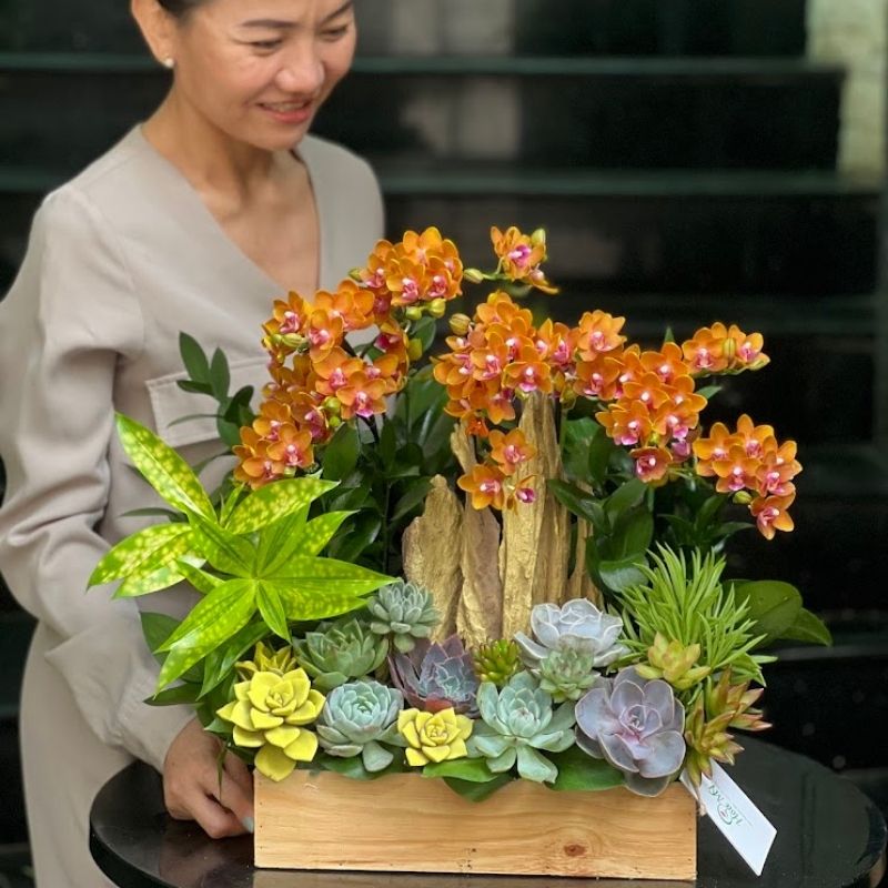 Nếu bạn đã quen thuộc với những chậu lan cao lớn truyền thống, thiết kế Lan Hồ Điệp Cam Mini phối Sen Đá trong khay gỗ này sẽ mang đến một làn gió mới: trẻ trung, năng động và đầy hơi thở nghệ thuật.