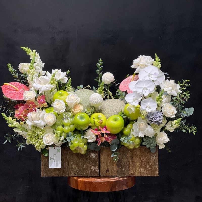 - Thành phần trái cây thường là táo xanh, nho xanh, dưa lưới và các loại quả tươi theo mùa. Được chọn lựa kỹ về độ tươi và hình thức.