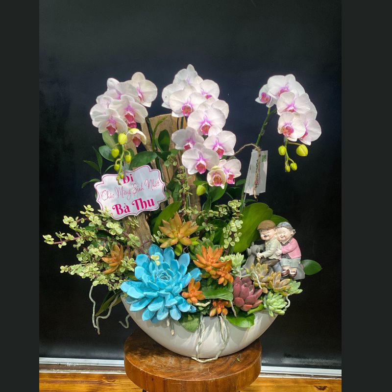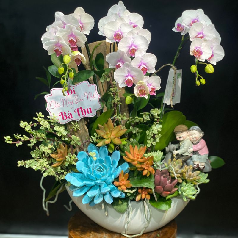 Tặng Bà, Mẹ: Thể hiện lòng hiếu thảo, cầu chúc sức khỏe dẻo dai như sức sống của sen đá và sự an nhàn, cao quý như lan hồ điệp.