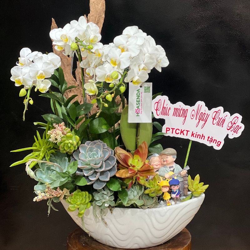 Giữa vô vàn những mẫu hoa rực rỡ, tác phẩm chậu hoa hình thỏi bạc hay còn gọi là thuyền hoa Lan Hồ Điệp mix Sen Đá này nổi lên như một bản giao hưởng của sự thanh cao và bền bỉ. Đây không chỉ là một lẵng hoa, mà là một lời chúc gói gọn cả chân tình dành cho những người phụ nữ yêu thương vào ngày Quốc tế Phụ nữ 8/3.