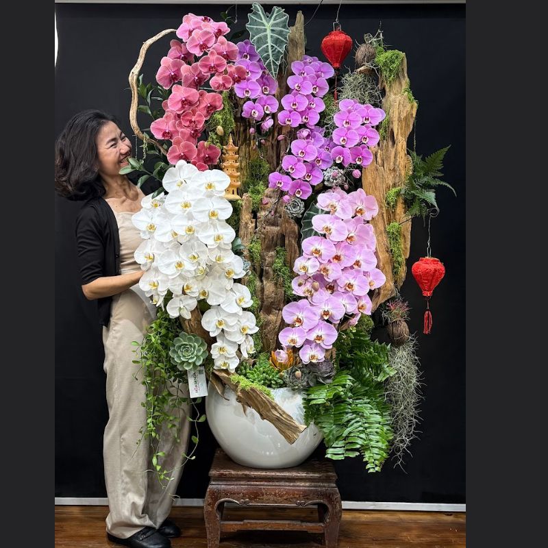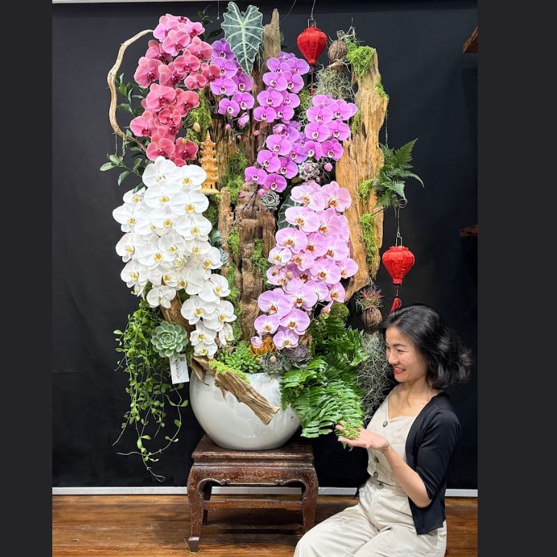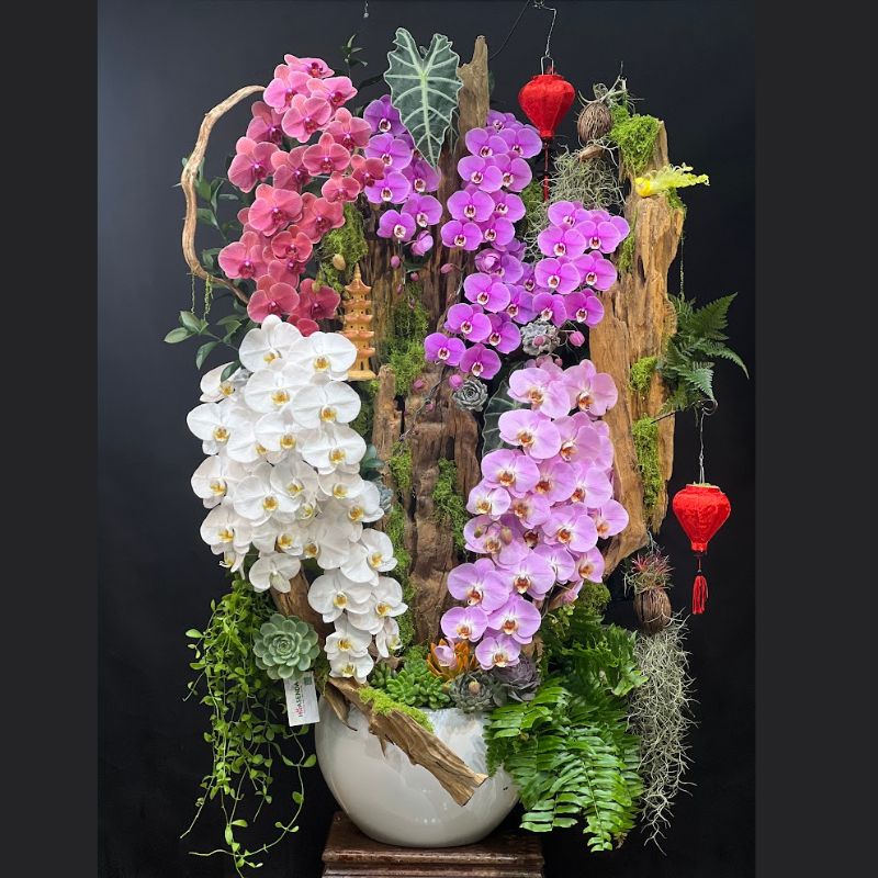 - Chậu: Lựa chọn chậu có kích thước phù hợp với gỗ lũa và lan hồ điệp, chất liệu sang trọng.