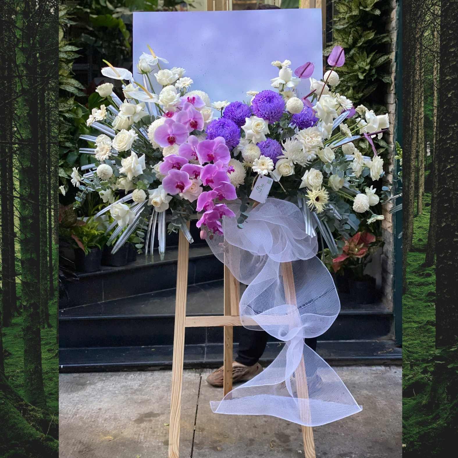 Giá một kệ hoa viếng tang đẹp, tông trắng tím kèm khung tranh là bao nhiêu?