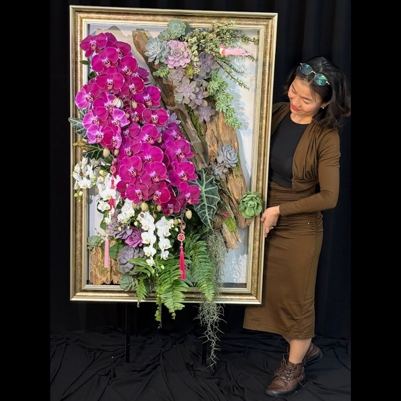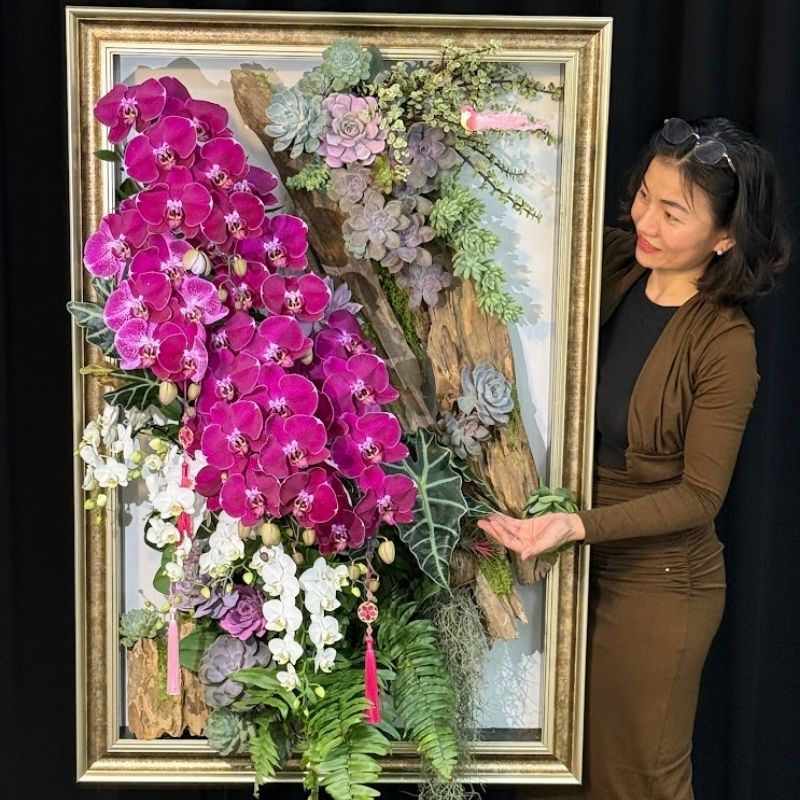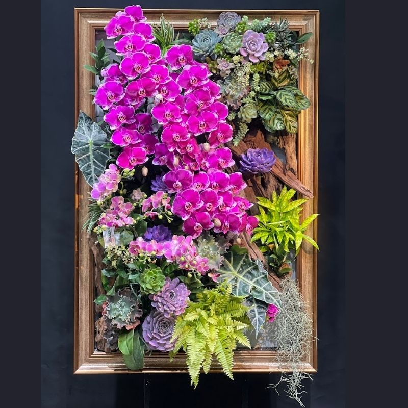 Bố cục “Tranh Trong Tranh”: Toàn bộ hệ sinh thái hoa lá được đặt trang trọng trong một khung tranh gỗ mạ vàng cổ điển. Cách thiết kế này biến những cành lan trở thành một tác phẩm điêu khắc sống động, có chiều sâu và sức sống mãnh liệt.